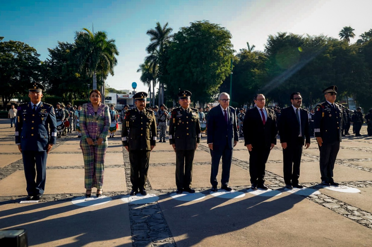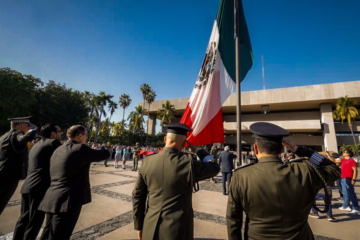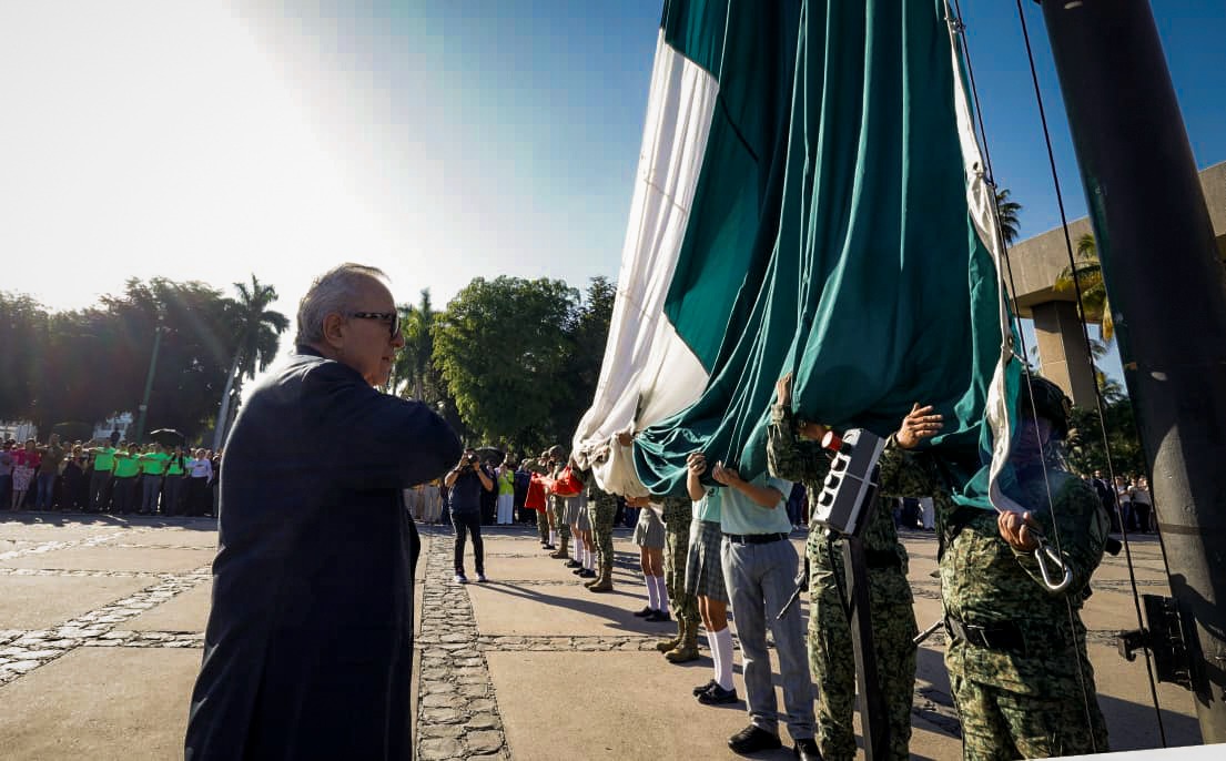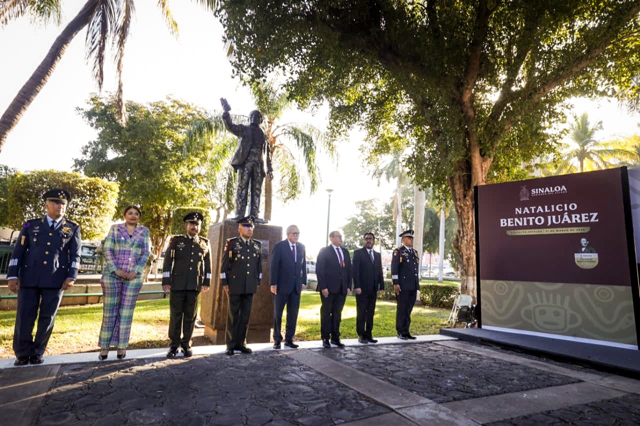 Culiacán, Sinaloa 21 de marzo de 2026.- Con izamiento de Bandera a toda asta y Honores de Ordenanza en la plaza cívica de Palacio de Gobierno, el gobernador Rubén Rocha Moya, acompañado de autoridades civiles y militares encabezó el acto conmemorativo del 220 aniversario del natalicio de Benito Juárez García, primer y único presidente indígena de México, promotor de las Leyes de Reforma, que sentó las bases de la modernización y el desarrollo del país, así como la consolidación de un Estado democrático.
