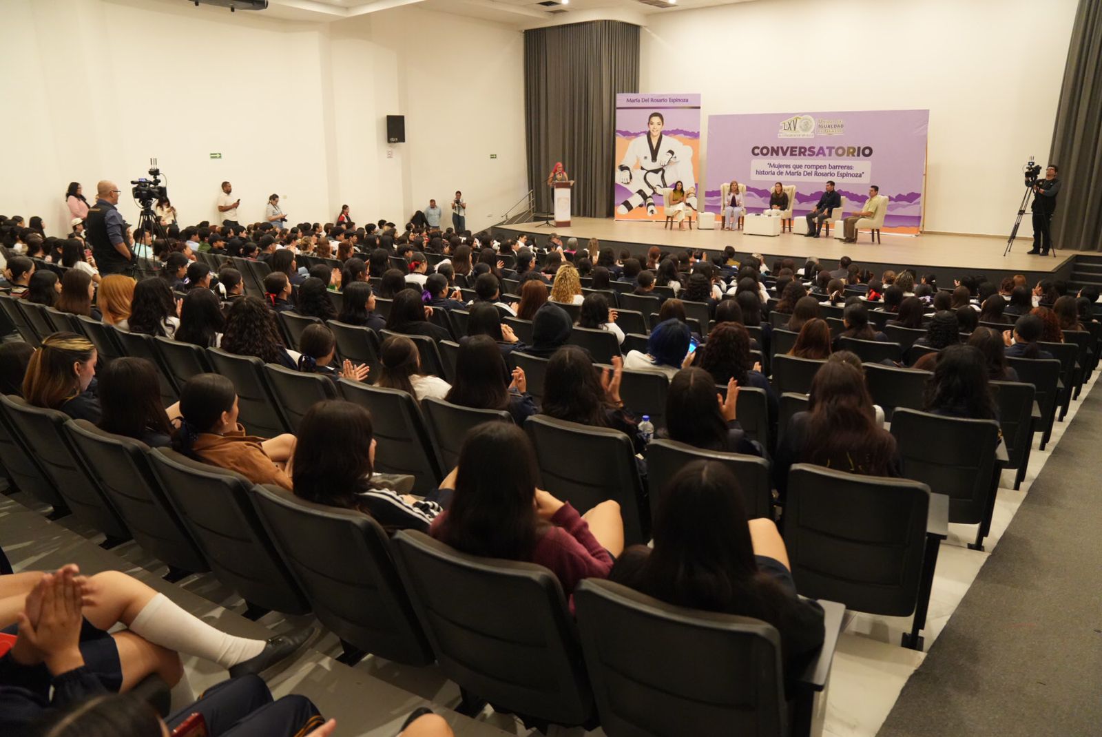 En un ambiente de entusiasmo juvenil y con la participación de autoridades estatales, municipales, comunidad educativa y deportistas, se llevó a cabo el conversatorio “Mujeres que rompen barreras: historia de María del Rosario Espinoza”, en el cual, la deportista compartió sus experiencias como triple medallista mundial.